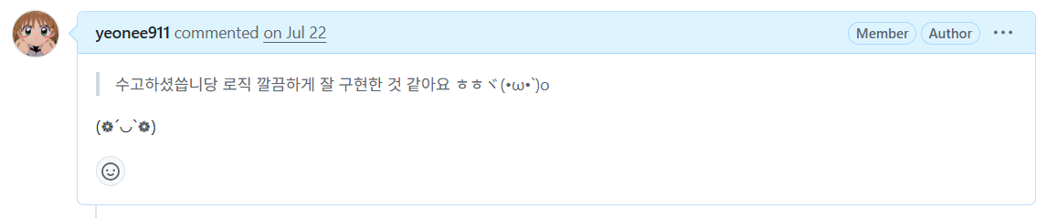 굵직한 기능을 개발할 때는 반드시 코드 리뷰를 하려고 노력했다. 특히 마지막에 진행했던 코드 리뷰가 정말 큰 도움이 되었다. 서로의 코드를 보면서 배울 수 있었을 뿐 아니라, 내가 놓친 부분이나 보완하면 좋을 부분(예: 검증 로직 추가)을 서로 댓글로 남겨주면서 성장 속도를 두 배로 끌어올릴 수 있었다. 가장 댓글이 많이 달린 PR은 무려 23개(ㅇㅁㅇ!!!)까지 달렸다. 무엇보다 서로 코드에 칭찬을 남기면서 동기부여도 되었다.